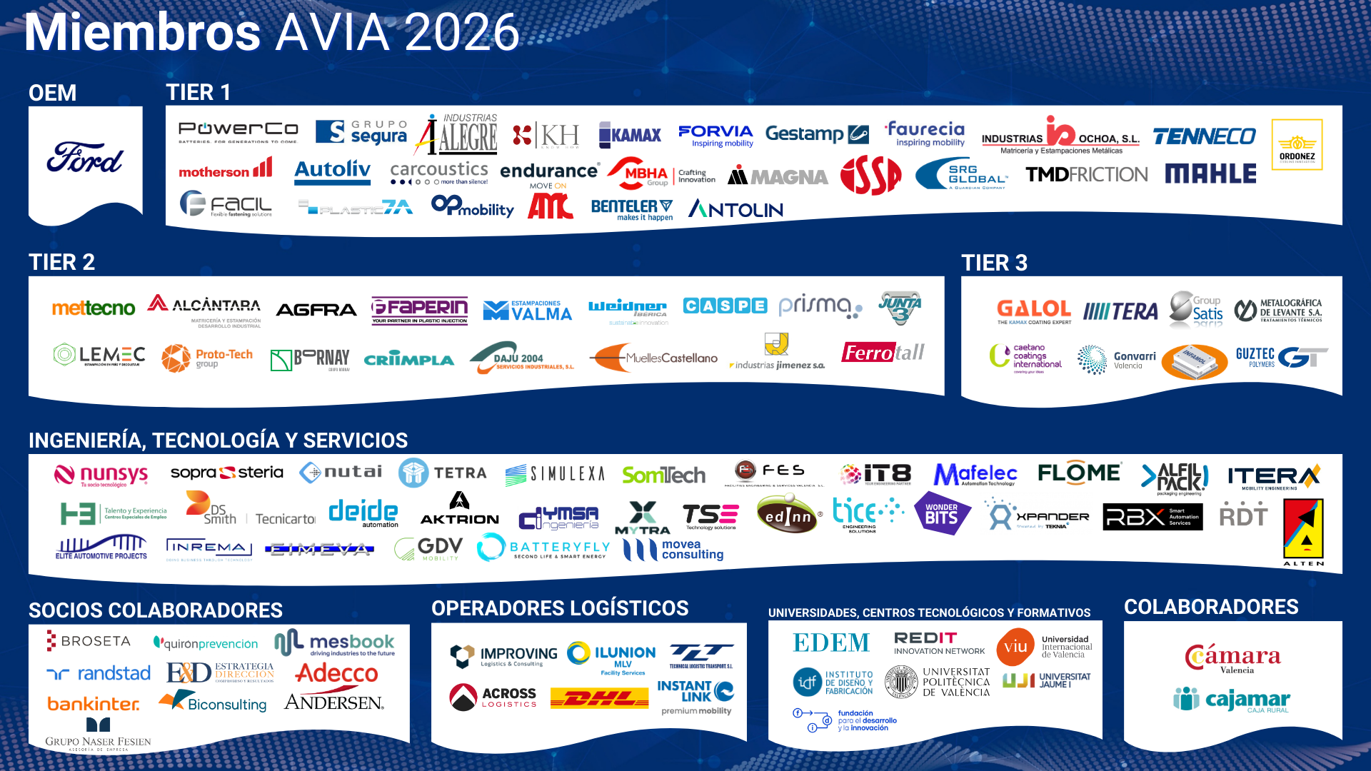 AVIA reúne a 121 empresas relacionadas con el sector de automoción. Empresas de los sectores metalmecánico, plástico, ingenierías, servicios, logística envase y embalaje y consultoras. Gracias a este carácter multisectorial AVIA reúne a toda la cadena de valor del sector.